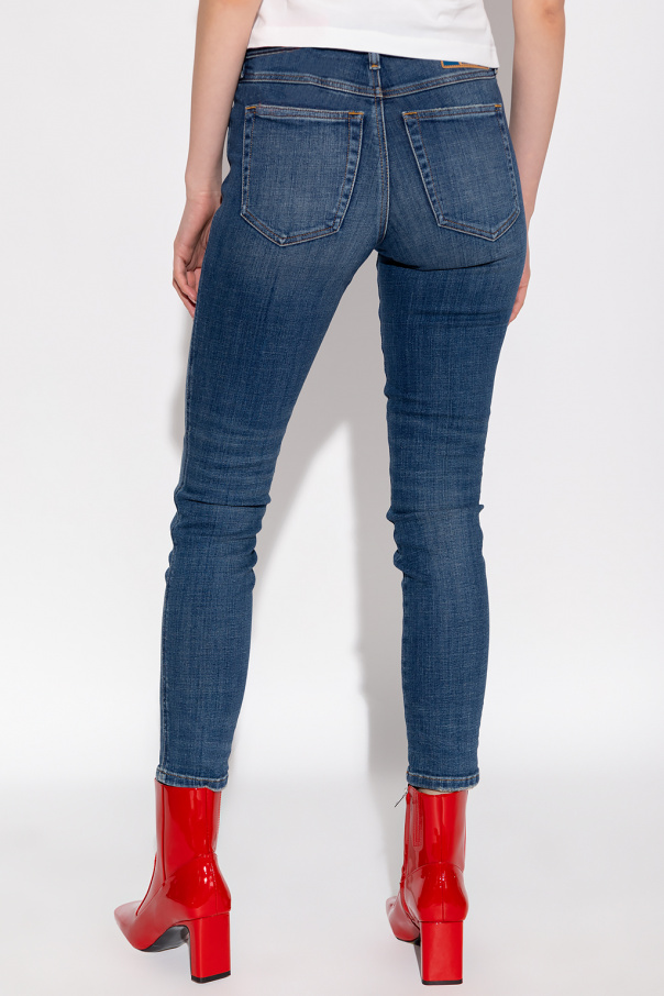 Navy ‘2015 BABHILA’ jeans from Diesel. Made of cotton, this tapered leg pair is complete with five slip pockets and logo patch at the back.