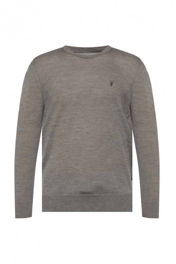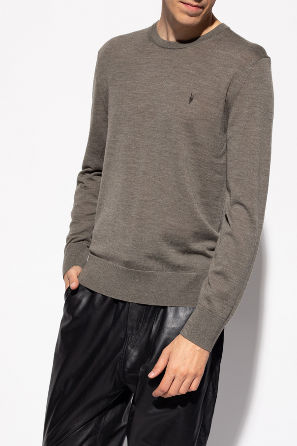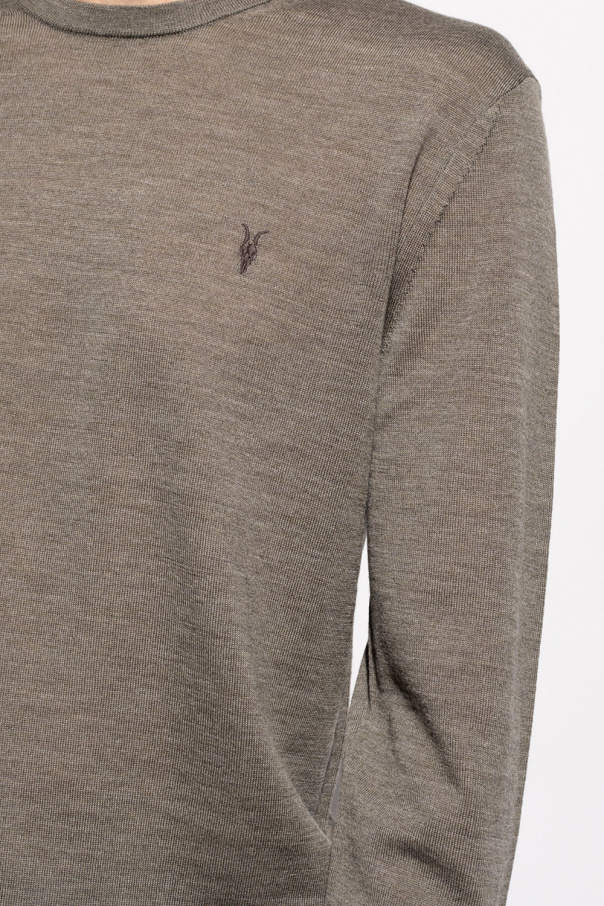 Green ‘Mode’ crewneck sweater from AllSaints. Crafted from wool, this style showcases the brand's signature Ramskull logo embroidered in dark green on the chest and ribbed trims on the edges.