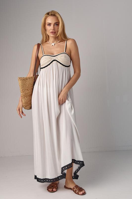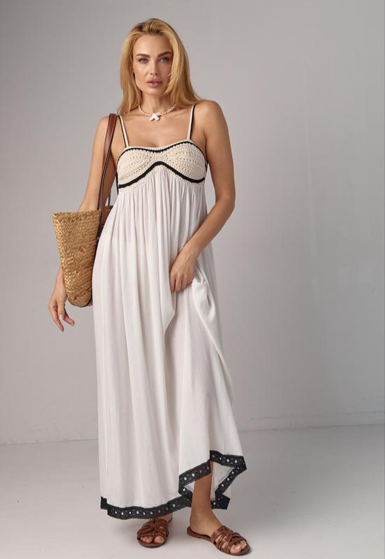 Особливе в цьому сарафані - його в'язаний ліф та бретелі. Вони додають невимушеного бохо-шарму, створюючи ідеальний баланс між стилем та комфортом. Внизу сарафана розташована мереживна тасьма, яка додає йому додаткового акценту.