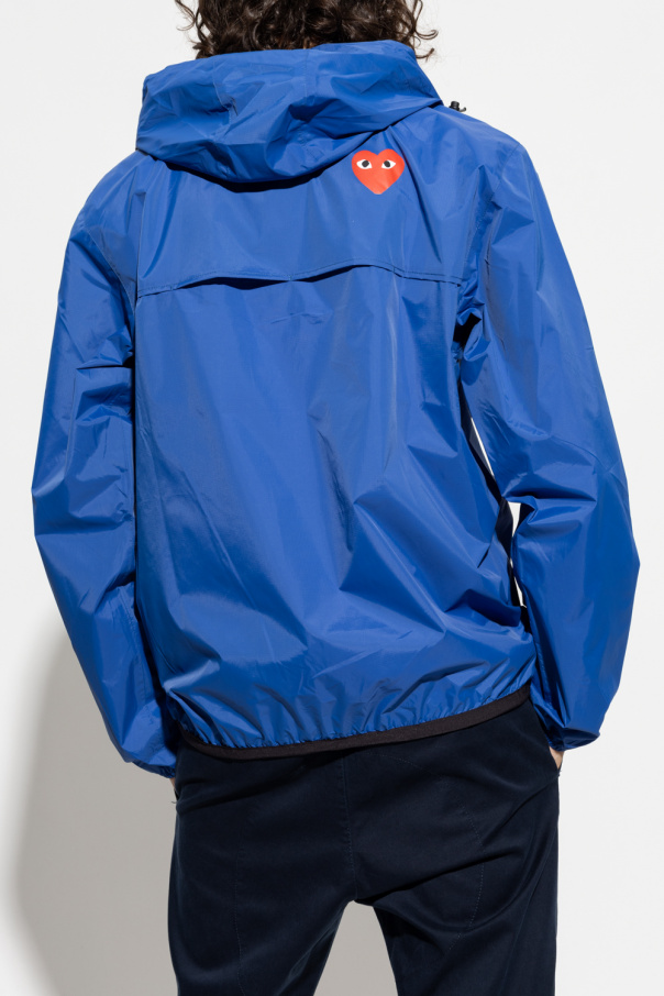 Dark blue rain jacket from Comme des Garçons Play x K-Way. Fastened with a short zip, this garment features a drawstring hood, the label’s signature heart motif, logo print, three zip pockets, drawstring hem and long sleeves with ribbed cuffs.