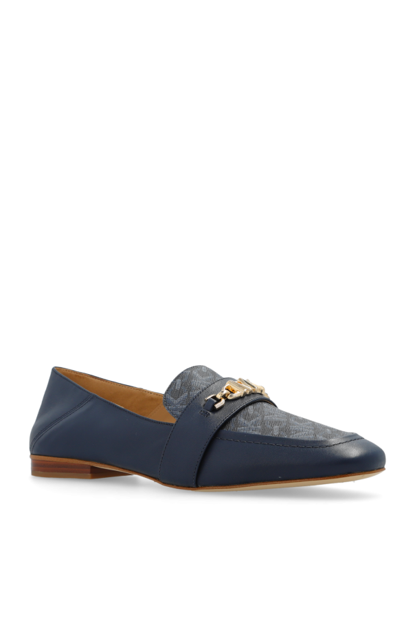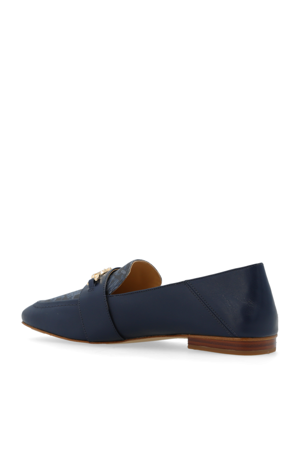 Navy ‘Tiffanie’ loafers from Michael Michael Kors. Made of leather and coated monogram canvas, this pair sits on a beige and brown rubber sole and is decorated with a logo detail in gold-tone metal.