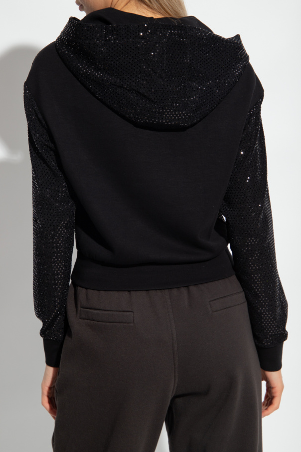 Black hoodie from EA7 Emporio Armani. Embellished with sequins, this long sleeve design features a silver-tone logo detail and ribbed trims at the hem and cuffs.