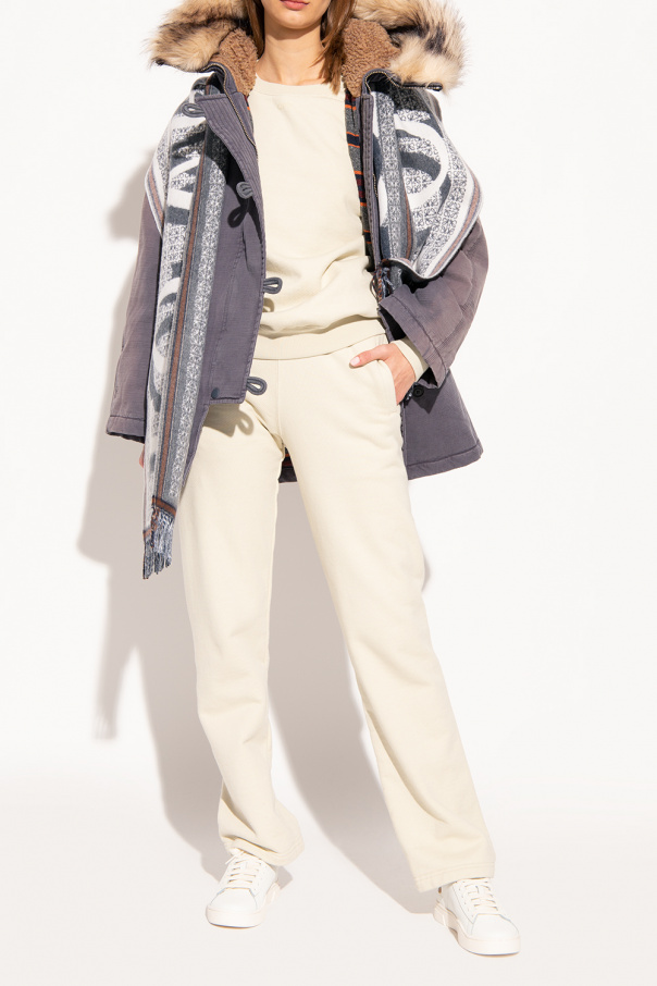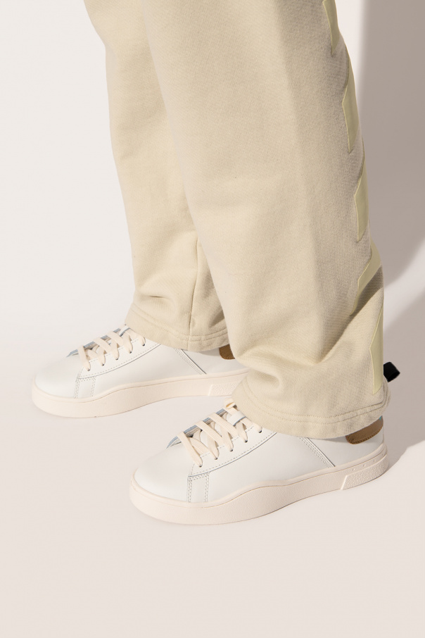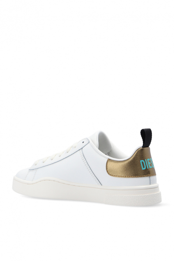 White sneakers from Diesel. Made of leather, this lace-up pair features a gold-tone and blue heel tab with a logo and a white rubber sole.