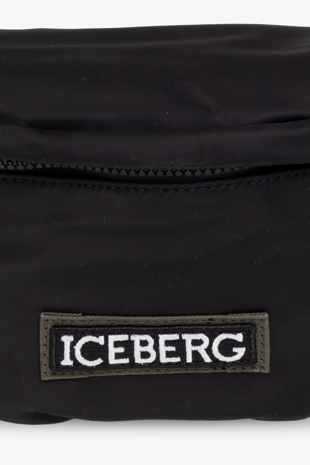 Black belt bag from Iceberg. Emblazoned with a green, black and white logo patch, this design secures with a zipper and features a back zip pocket, an adjustable strap, black metal hardware and one internal compartment with one zip pocket.