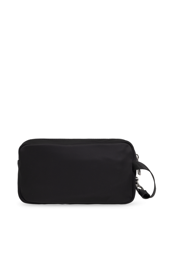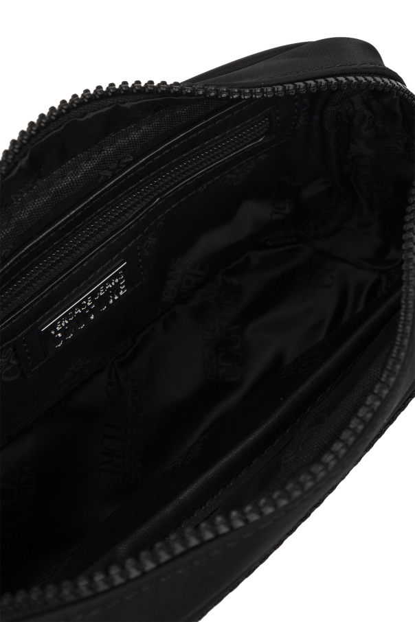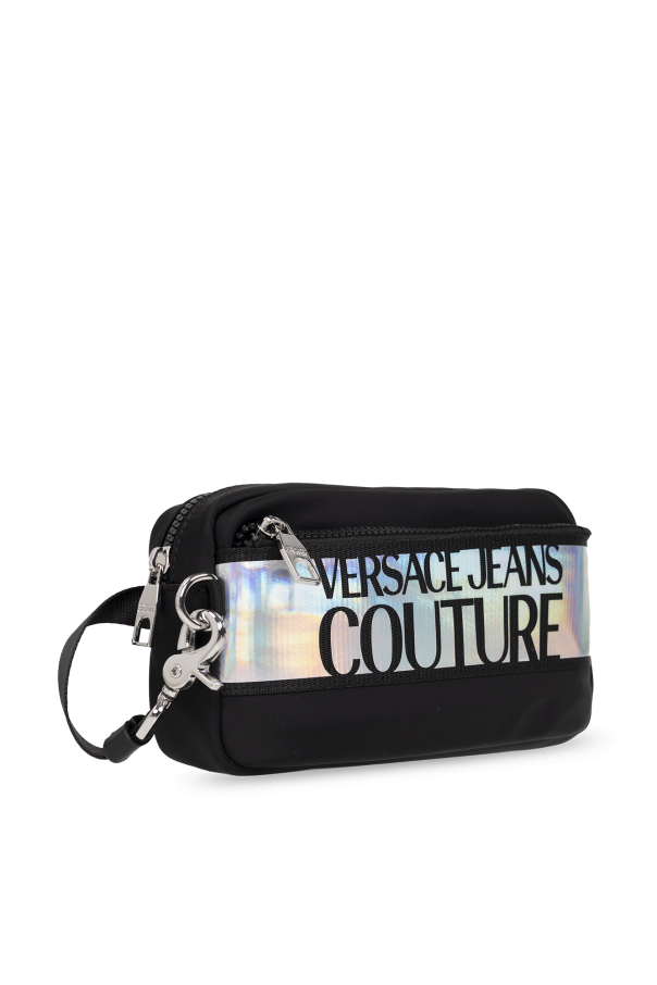 Black wash bag from Versace Jeans Couture. Made of fabric, this model fastens with a zip and is decorated with a holographic print and logo. It is complete with a zipped front pocket, half-round handle to the side with a clip, silver-tone metal hardware and one internal compartment with one zip pocket and one slip pocket.