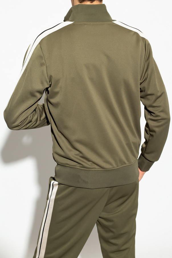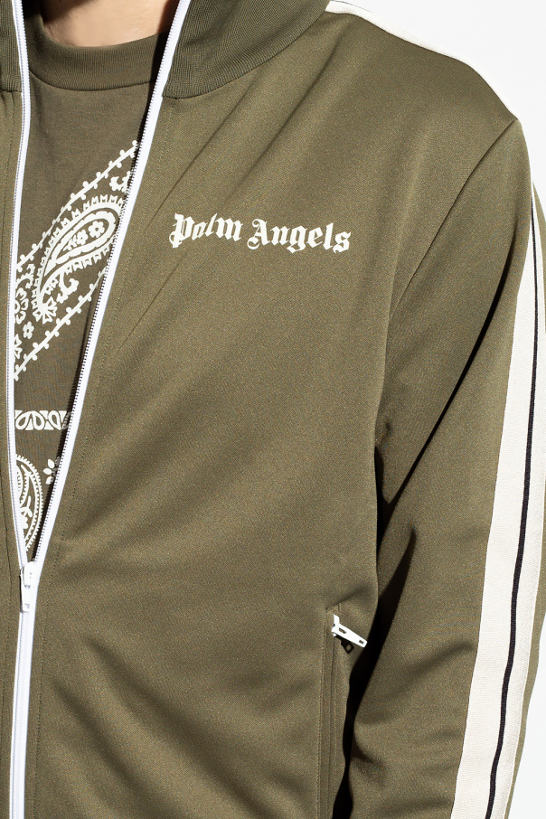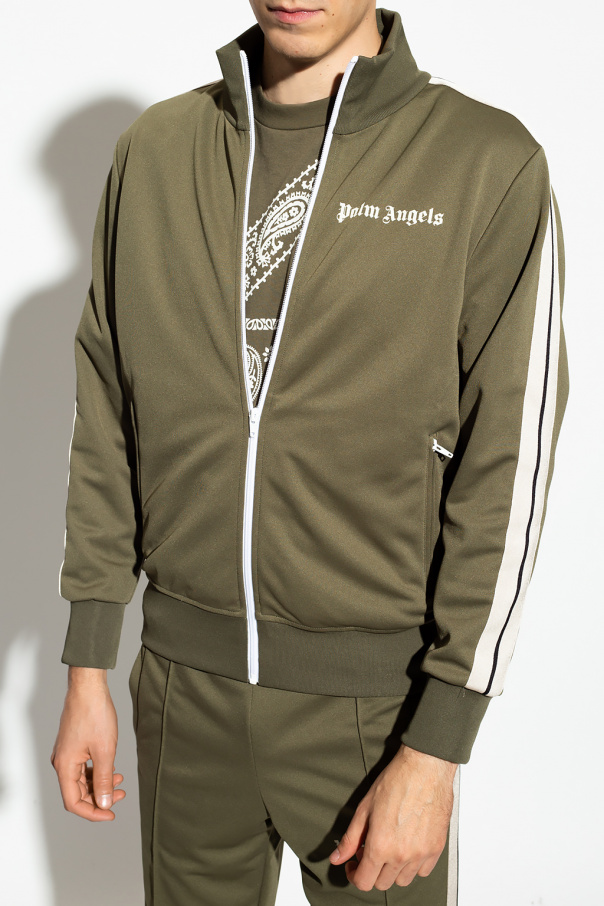 Green sweatshirt with a standing collar from Palm Angels. Enriched by a logo pattern, this style features a zip fastening, two zipped pockets, stripes on the sleeves and elasticized trims on the edges.
