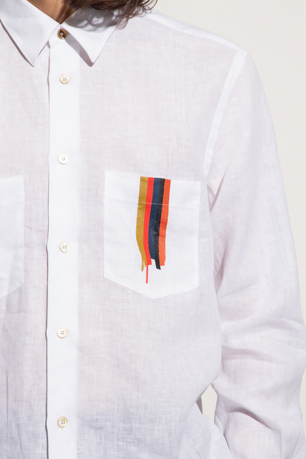 White shirt from Paul Smith. Made of linen, this style features button fastenings, long sleeves with button cuffs and two frontal pockets – one flaunts a colourful graphic print.