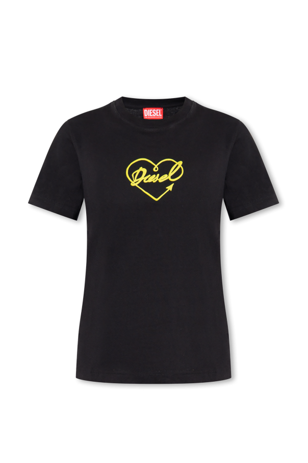 Black ‘T-REG’ T-shirt from Diesel. Made of cotton, this garment features a light green heart print, logo, ribbed crew neck and short sleeves.
