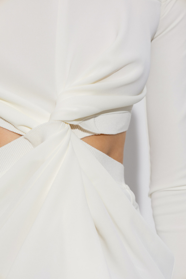 White ‘Twisted’ top from JW Anderson. Distinguished by cut-out details, this style features long sleeves with elasticated cuffs and navy blue stripe trims.
