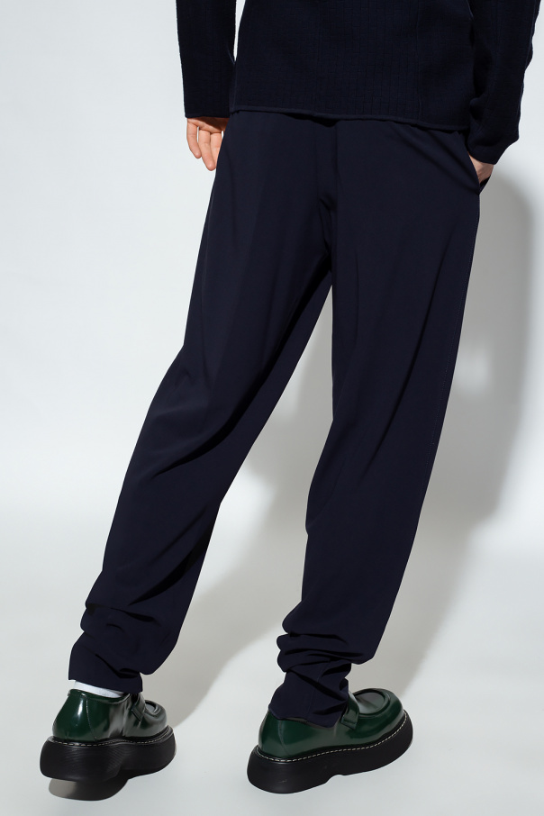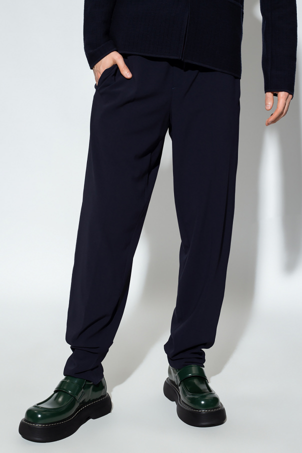 Navy trousers from Giorgio Armani. Made of wool, this pair falls down with slightly tapered legs and features a zip, hook and button fastening, drawstring waist, two front pockets and one snap-fastened back pocket.