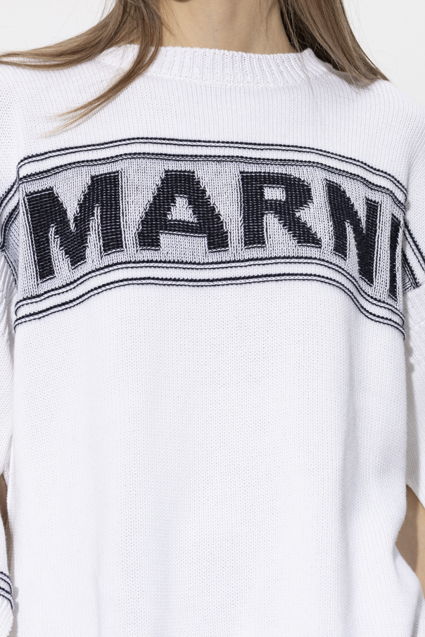 White crewneck sweater from Marni. Crafted from cotton, this style features logo embroidery, side slits, long sleeves and an elasticated collar and cuffs.