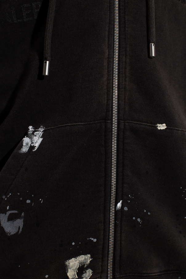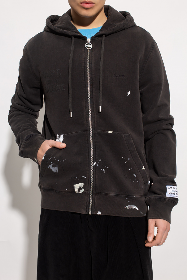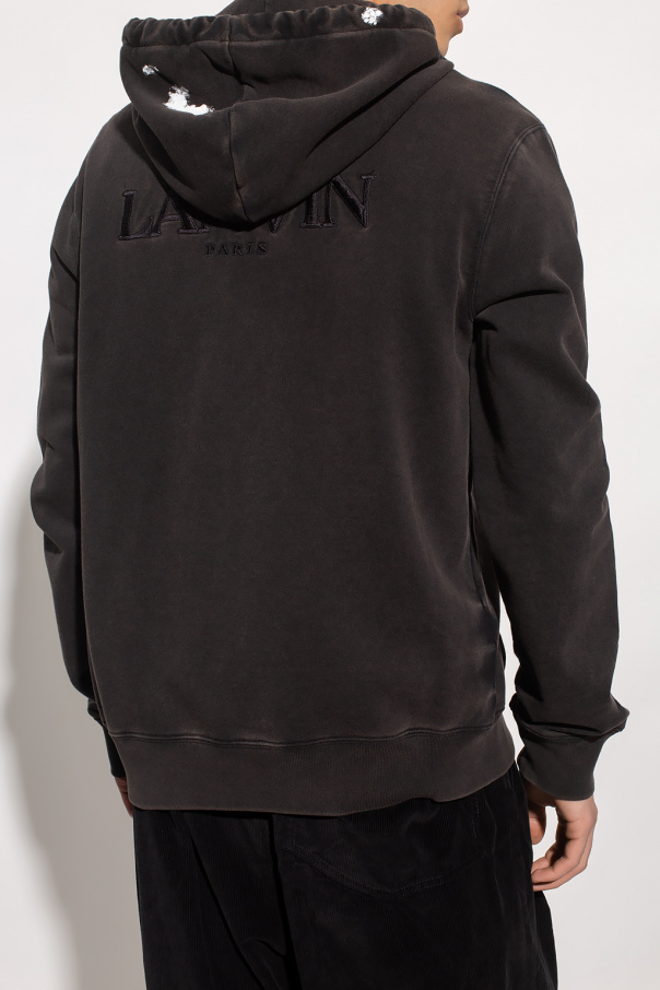 Black hoodie from Lanvin x Gallery Dept. Made of cotton, this garment features a logo embroidery, paint splatter effect, patch by Josué Thomas, two front pockets, drawstring hood and ribbed trims at the hem and cuffs.