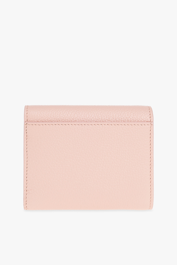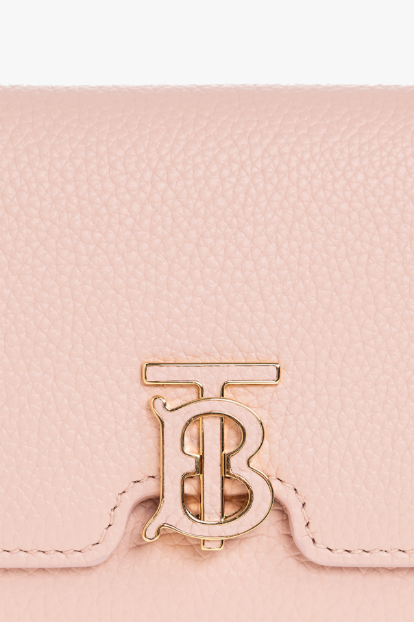 Pink folding wallet from Burberry. Crafted from calf leather, this design features a snap fastening, a logo-shaped plaque on the front, a back slip pocket, gold-tone metal hardware and one bill compartment, one zip coin pocket, two slip pockets and seven card slots inside.