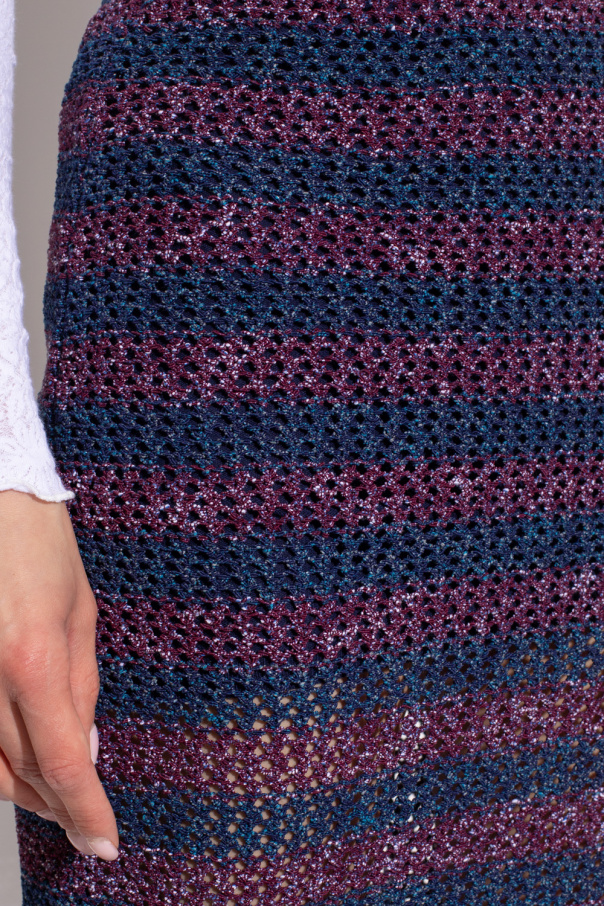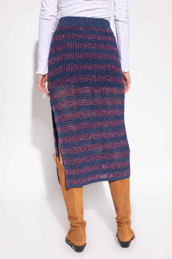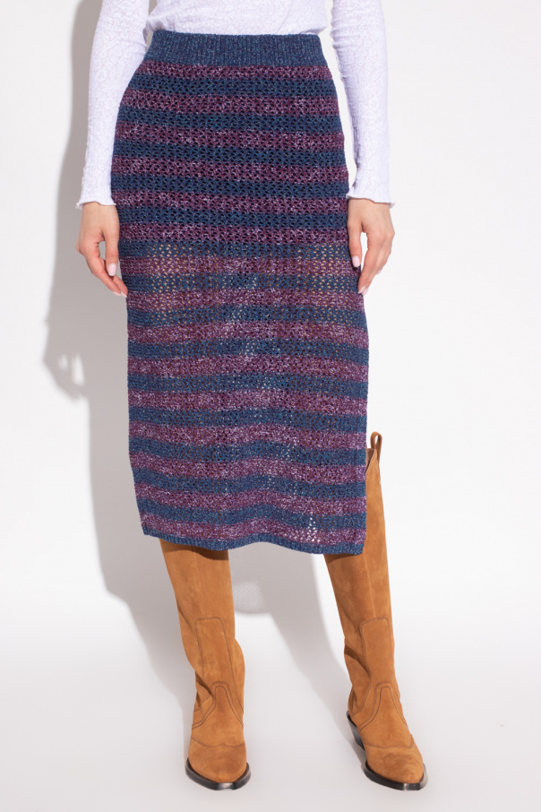 Navy blue and maroon woven skirt from Rag & Bone. Crafted from a blend of recycled materials, this style features an elasticated waistband, a stripe pattern, a cotton lining and a side split for walking ease.