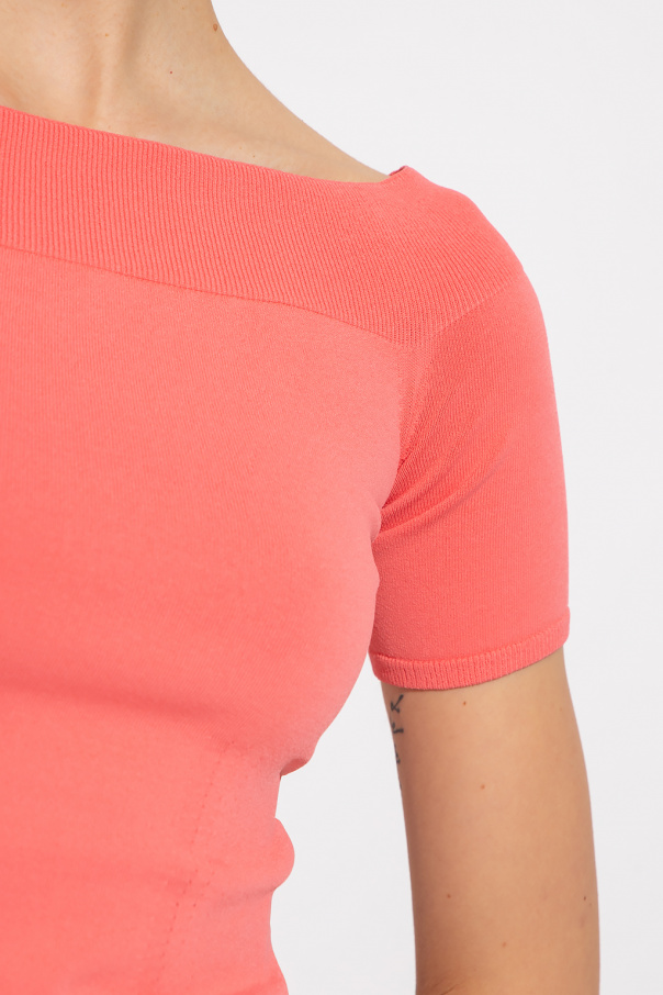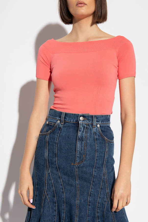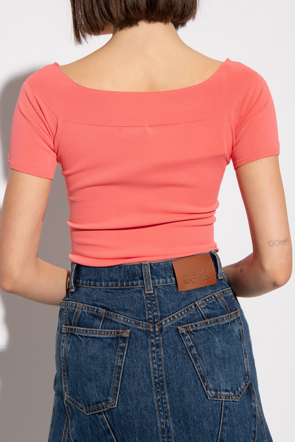 Pink off-the-shoulder top from Alexander McQueen. This short sleeve design is enriched by decorative stitching details and ribbed trims at the neck, cuffs and hem.