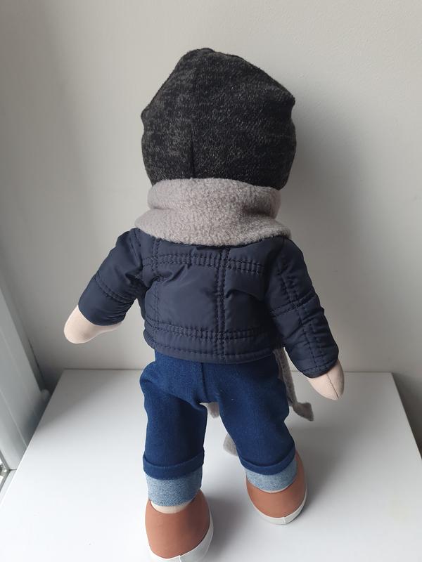 Возраст: от 3 летКуколка мальчик «Эмиль» одет в свитерок, стеганую куртку и джинсы. Обута куколка в коричневые кеды, а на голове у него серая шапочка с лейбочкой и серый шарф.