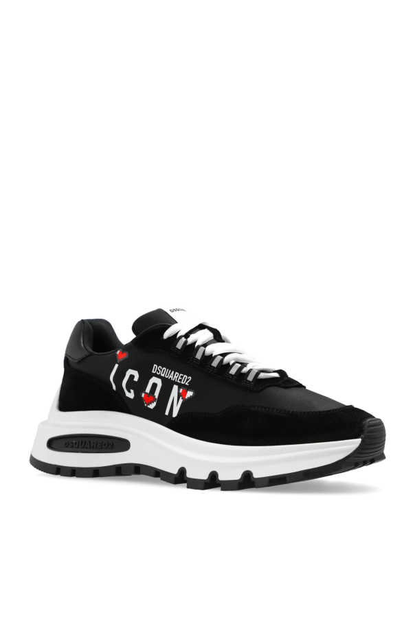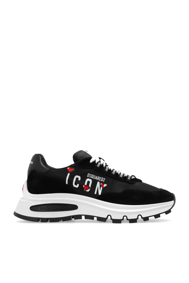 Black ‘Run DS2’ sneakers from Dsquared2. Crafted from fabric and leather, this lace-up model sits on a black rubber sole with a red insert and showcases a white and red logo print and suede overlays.