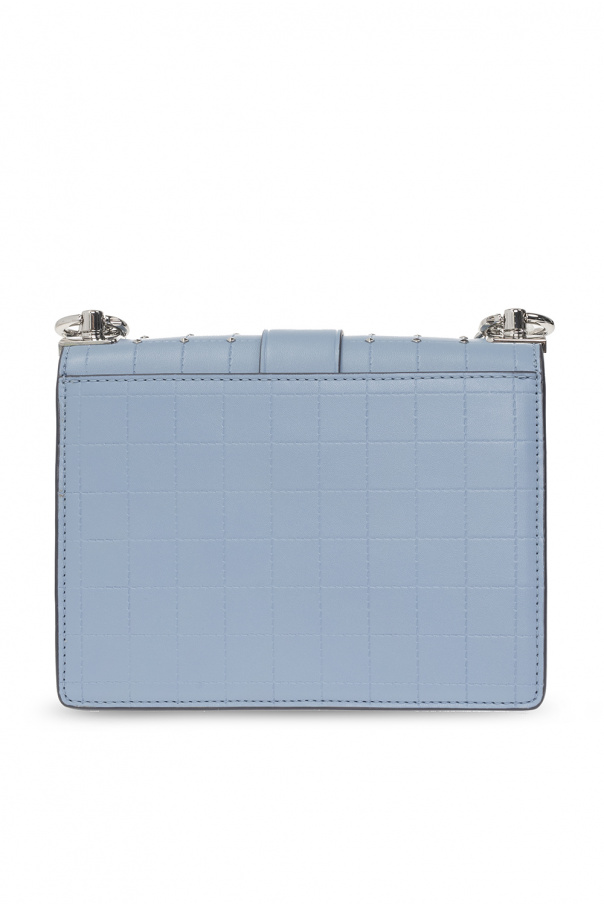 Blue ‘Greenwich’ shoulder bag from Michael Michael Kors. Crafted from faux-leather, this design secures with a pivotal logo fastener and showcases an embossed check pattern and stud embellishments. It is complete with a chain-reinforced shoulder strap, silver-tone metal hardware and a dark beige clad interior with one compartment, one flap pocket, three card slots and one slip pocket.