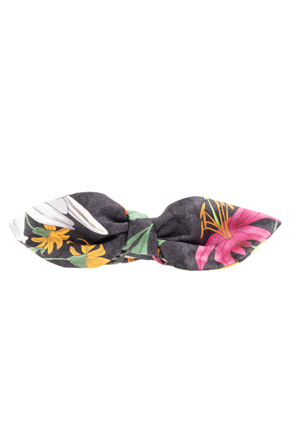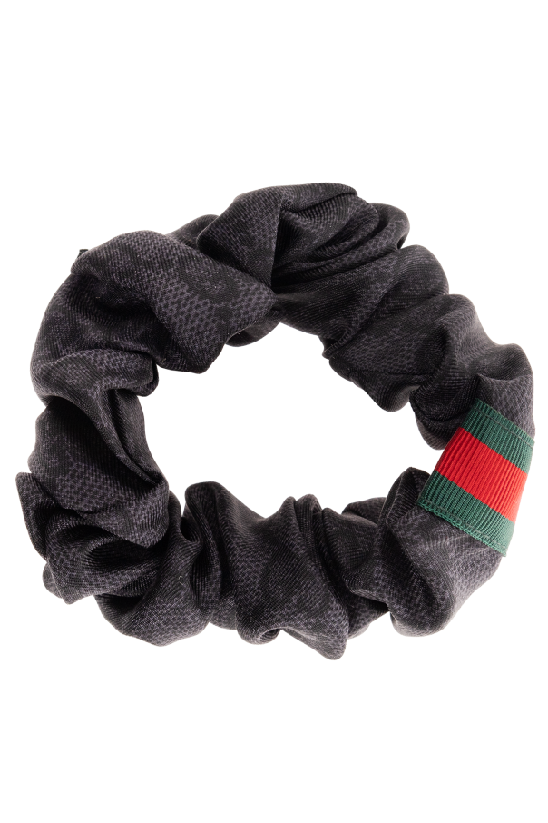 Black scrunchie two-pack from Gucci. Made of silk, each item showcases a colourful floral motif accompanied by a green-red-green Web stripe.
