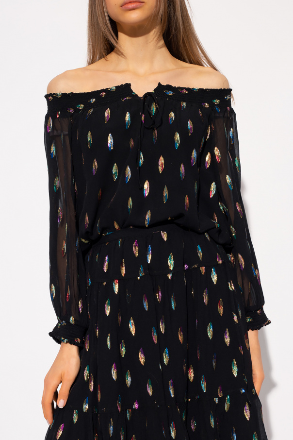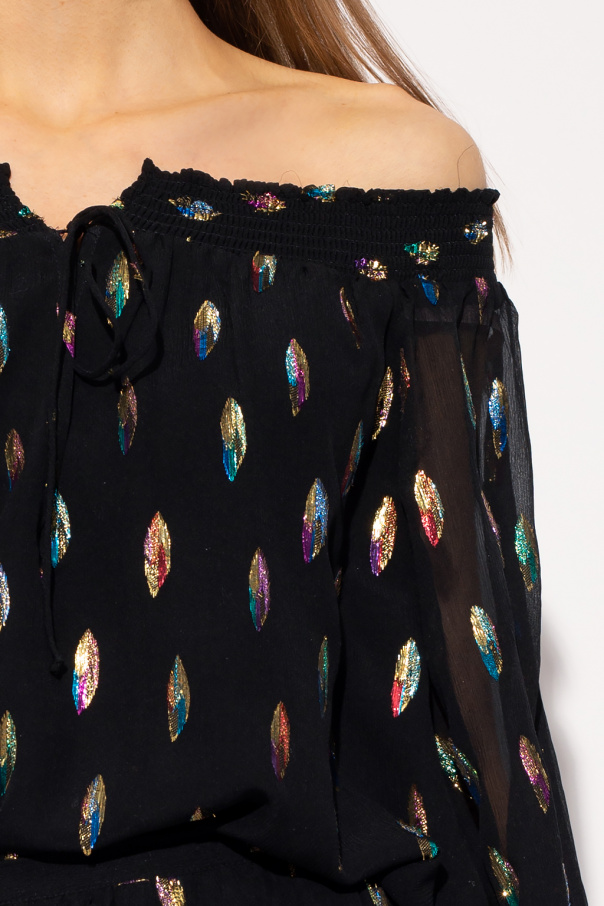 Black off-the-shoulder top from See By Chloé. Made of silk, this garment features a slit at the neck with drawstrings, multicolored lurex threads and cropped sleeves with elasticated cuffs.