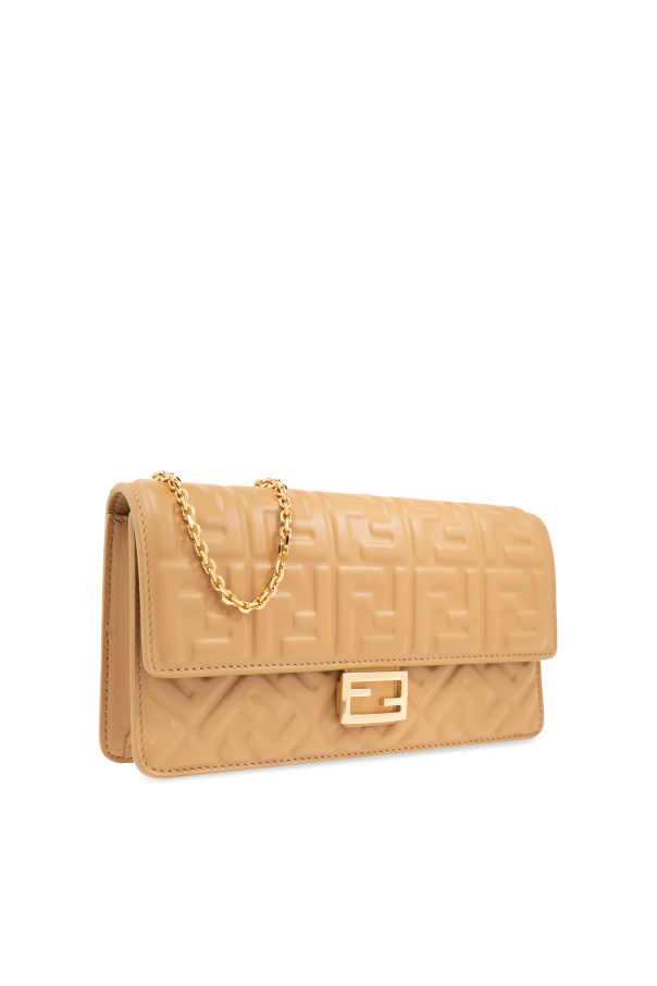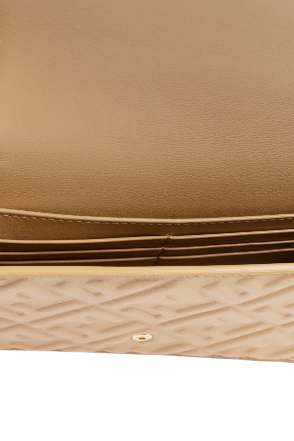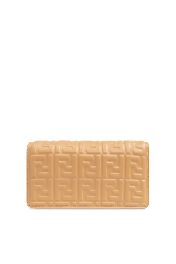 Introducing the Shoulder Wallet by the illustrious fashion house Fendi. This luxurious accessory, meticulously crafted from premium leather, epitomizes timeless elegance and sophistication. The wallet boasts a sleek rectangular shape with a flap closure, adorned with a distinctive embossed pattern of symmetrically arranged \"F\" letters, a hallmark of the brand. Its refined beige hue lends it a subtle yet elegant appearance, making it a quintessential piece for the discerning fashion aficionado. Inside, the wallet is lined with matching leather, ensuring both durability and a cohesive aesthetic. It features a spacious compartment, six card slots, and a convenient slip pocket, offering ample storage for your essentials. The shoulder wallet is accentuated by a short golden chain strap, perfect for carrying on the shoulder or by hand, and also includes an adjustable leather strap with a golden clasp for added versatility. The flap closure is secured with a gold-tone rectangular buckle, elegantly emblazoned with the iconic \"F\" logo, further accentuating its luxurious appeal. Why You Should Buy This Product Exquisite design and premium materials Signature embossed pattern and logo Versatile carrying options with gold chain and adjustable leather strap Ample storage with multiple card slots and compartments Timeless elegance from a renowned fashion house