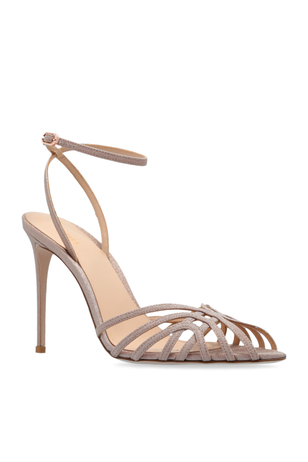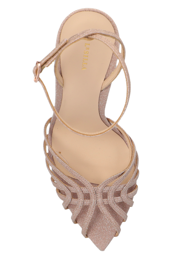 Light pink ‘Bella’ heeled sandals from Le Silla. Made of leather with a glitter finish, this pair features an adjustable buckle strap and a beige sole in rubber and leather.