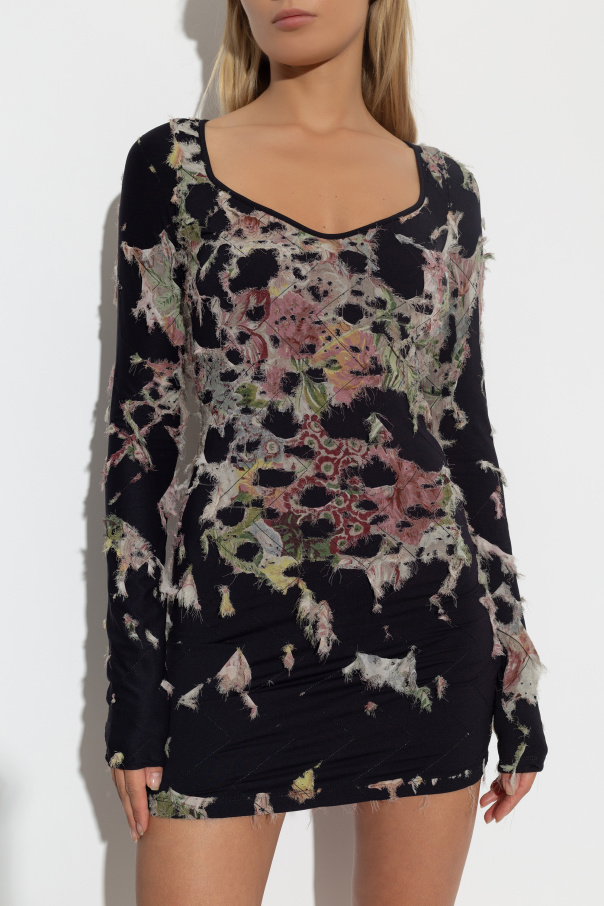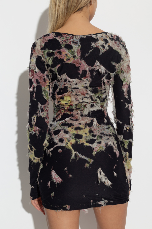 Introducing the Diesel D-FLOCI A17033 Dress, a masterpiece from Diesel\'s exclusive collection, designed for the discerning fashion connoisseur. This mini dress epitomizes modern elegance and avant-garde design, crafted to make a statement. The dress features a short, form-fitting silhouette with long, sleek sleeves and a deep, round neckline, offering a sophisticated yet daring look. Made from 100% viscose, this piece boasts a rich black fabric adorned with vibrant, multicolored patterns. These patterns, reminiscent of floral and abstract motifs, are enhanced with intentional distressing and raw edges, giving the dress a unique, edgy appeal. Adding to its distinctive charm, the dress includes strategically placed rips and tears, embracing a fashionable nonchalance. Inside the neckline, a red label with the iconic white \"DIESEL\" inscription is discreetly displayed, affirming its authenticity and elite craftsmanship. Why Buy This Product? Exclusive Design: A unique piece from Diesel\'s high-end collection. High-Quality Material: Made from 100% viscose for a luxurious feel. Distinctive Style: Features eclectic patterns and raw finishes for a bold look. Brand Credibility: Diesel\'s renowned craftsmanship and innovative design.