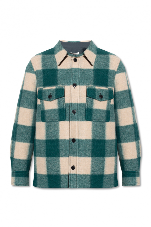 Cream and green jacket with a collar from Isabel Marant. Crafted from a wool blend with a check pattern, this style features button fastenings, two slip pockets, two flapped pockets with buttons and long sleeves.