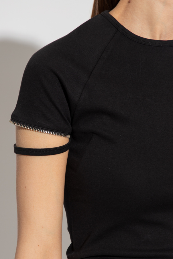 Black ‘Zip Baby T’ T-shirt from Helmut Lang. Crafted from cotton, this garment features a ribbed crew neck and short sleeves with silver-tone zip details.