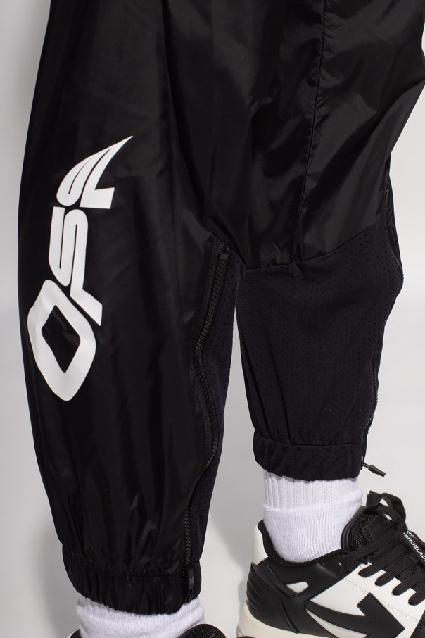 Black track pants from Off-White, the ‘Active’ line. This pair features an elasticated waistband with a distinctive belt with a snap closure, two slip pockets and elasticated cuffs with zipped vents.