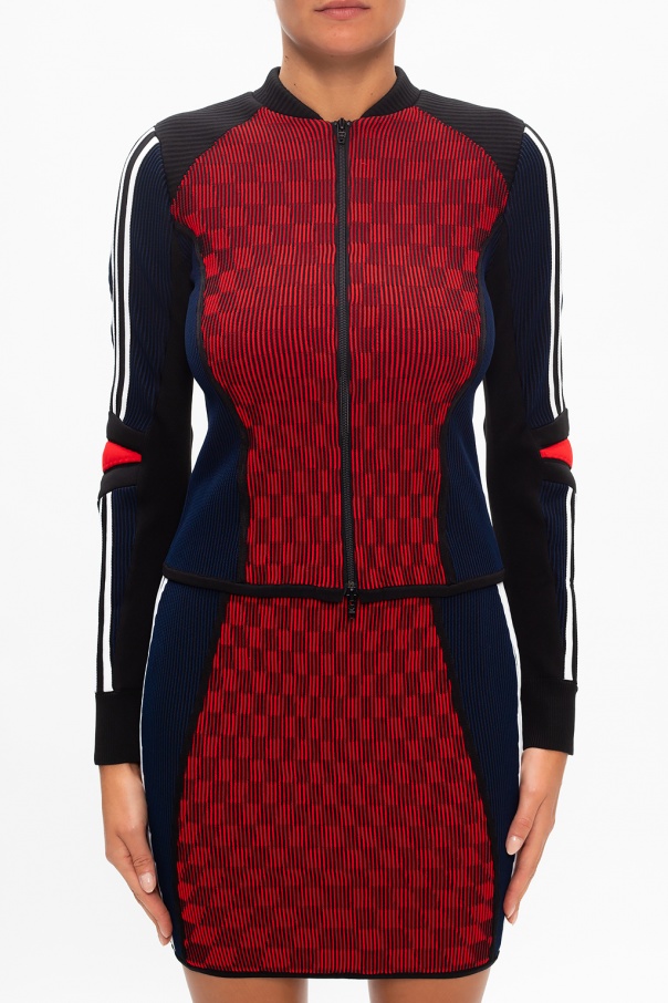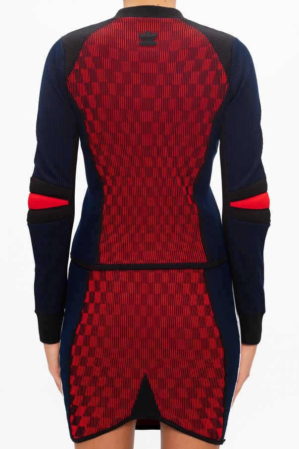 Navy blue, black and red track top from ADIDAS Originals x Paolina Russo. Featuring ribbed structure, this style fastens via zip closure and showcases rubberised tactile black logo detail on the back.