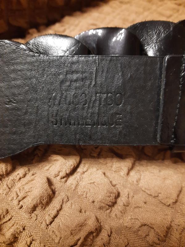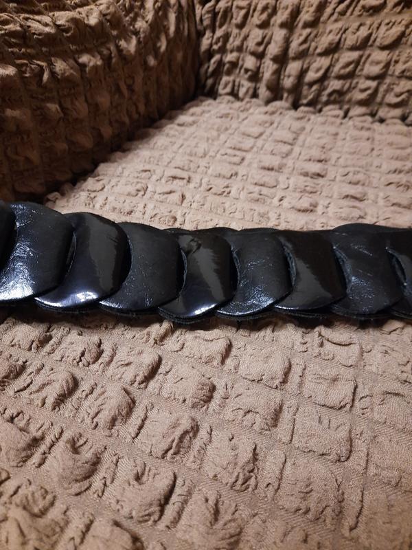 Модный стильный плетеный ремень(SYNTHETIQUE, Франция). Мягкий кожзам. Цвет черный, имитация лаковой кожи. Общая длина без пряжки 90 см. Ширина по плетению 5,5 см., ширина по застежке 4см. От края ремня до первого отверстия 7см, шаг отверстий 2,5см, отверстий-3шт. Фото частично искажают внешний вид, делают его более массивным. Вживую смотрится не грубо, интересно и элегантно, ведь производитель Франция.