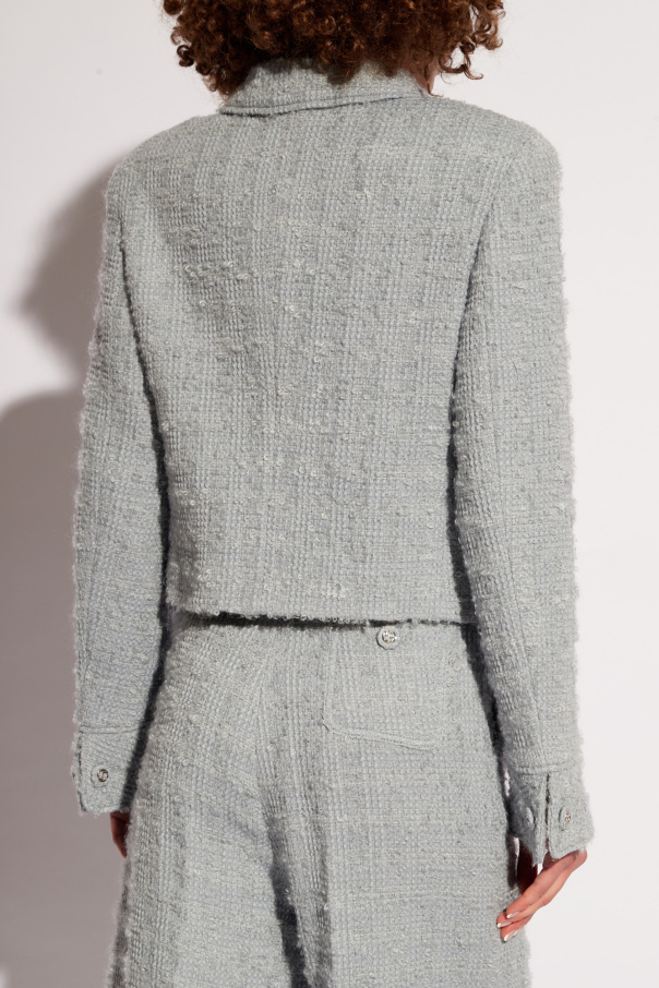 Blue tweed blazer from Gucci. Made from a wool and mohair blend, this style features a classic collar, button fastenings, three pockets and long sleeves.