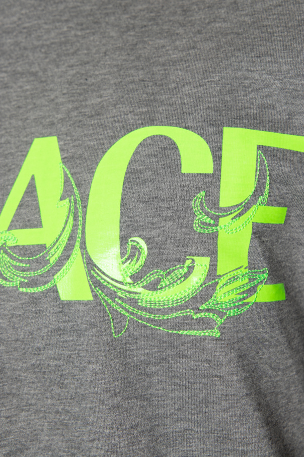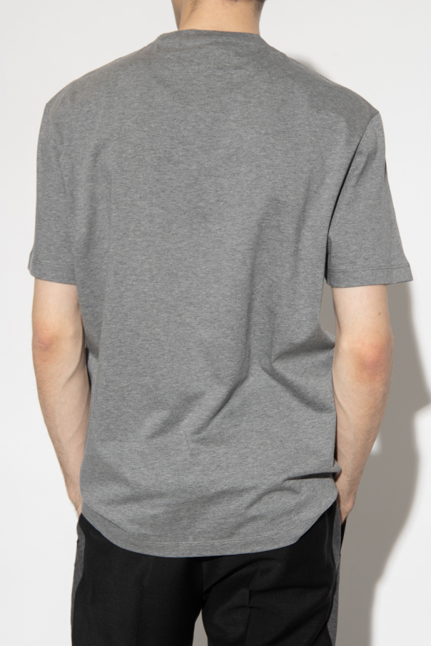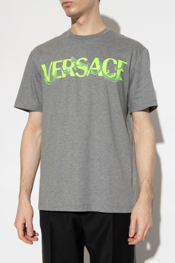 Grey crewneck T-shirt from Versace. Made of cotton, this style features short sleeves, an elasticated collar and the brand\'s logo rendered in green print and embroidery.
