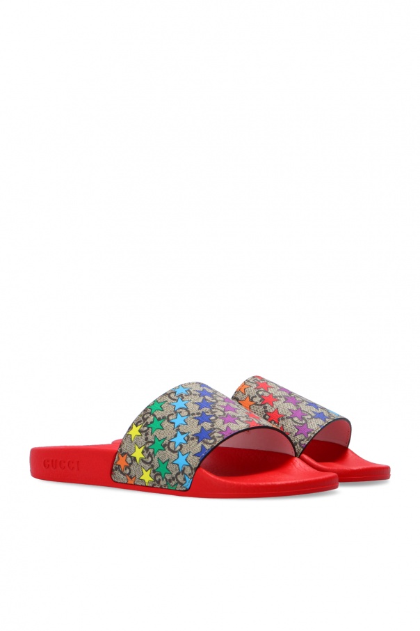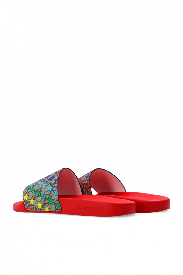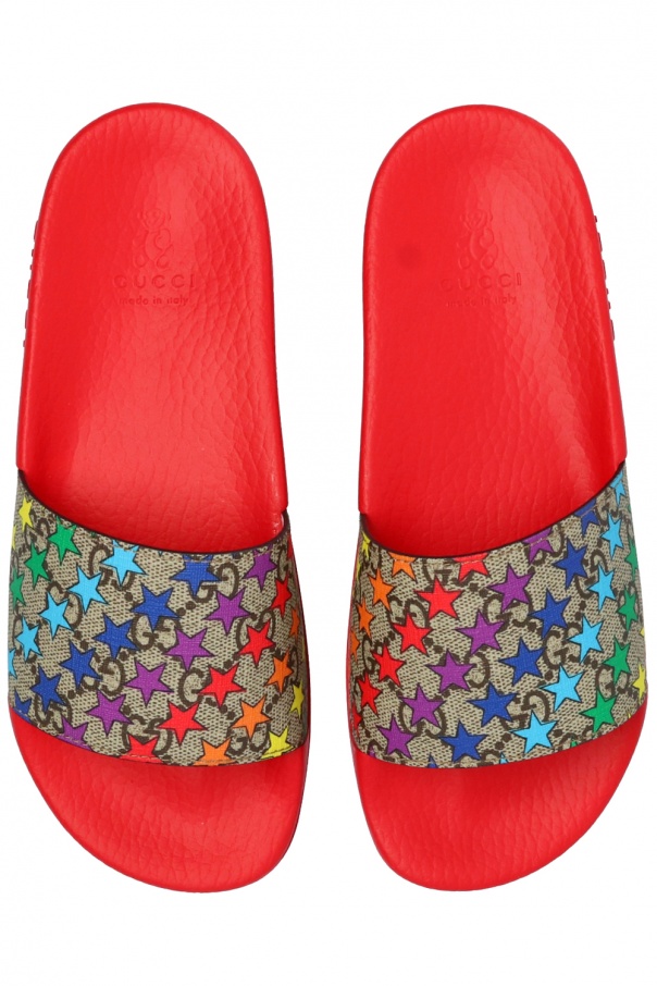 Multicoloured slides from Gucci Kids. Showcasing a logo pattern print, this leather-trimmed pair sits on a red rubber sole.