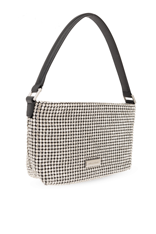 Introducing the quintessence of modern elegance and luxurious design, the ‘Diamante Small’ Shoulder Bag by the esteemed designer Self Portrait. This exquisite accessory is a testament to refined taste, showcasing a dazzling silver hue that captivates the eye. Its surface, meticulously adorned with shimmering elements reminiscent of crystals or sequins, exudes sophistication and opulence. The bag’s rectangular silhouette with gently rounded corners gracefully tapers at the top, presenting an aesthetically pleasing form. A contrasting black strap, crafted from premium calf leather, offers a comfortable shoulder carry, while the silver finish of the bag sparkles with every movement. A notable metal plaque bearing the brand\'s name adorns the front, signifying the luxury and exclusivity associated with Self Portrait. Constructed with the utmost care, the ‘Diamante Small’ features a secure black zipper closure at the top, ensuring the safety of your belongings. The interior, likely fashioned from a high-quality dark-hued polyester, promises durability and practicality, reducing visibility of stains and making it an ideal companion for both day and night adventures. Why Purchase This Product? Luxurious design with crystal embellishments that offer a radiant sparkle. High-quality materials including 100% polyester and genuine calf leather, ensuring durability and elegance. Practical features such as a secure zipper closure and a dark interior for ease of maintenance. Signature Self Portrait branding, enhancing its exclusivity and value as a collector’s item. Compact yet practical, with an internal compartment for card storage, making it perfect for both formal events and casual outings.