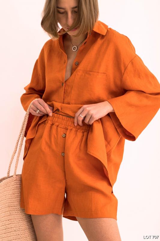 ⚡️Летний костюм: оранжевая рубашка свободного кроя и оранжевые шорты на резинке с дополнительными пуговицами⚡️