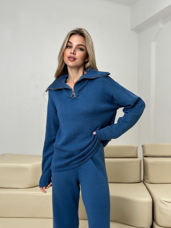 В’язаний костюм із бавовняної нитки з штанами палацо. Штани виконані дрібною в’язкою. Трохи подовжена кофта з блискавкою на вороті. Якість люкс