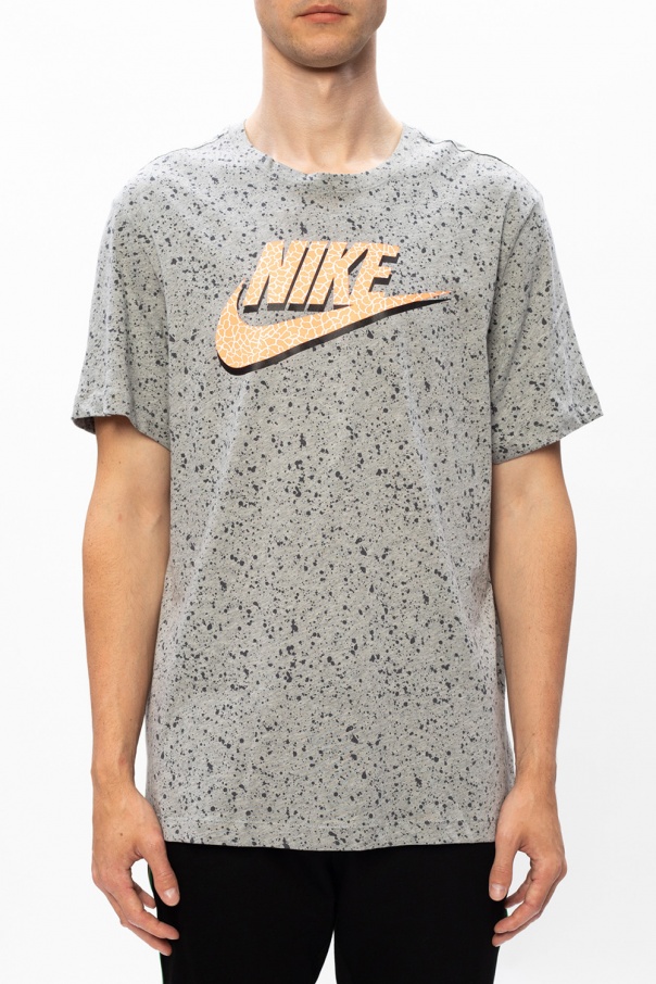Grey T-shirt from Nike. Crafted from cotton, this item features a round neck and short sleeves and is enriched by a black pattern and a logo print in yellow, black and white