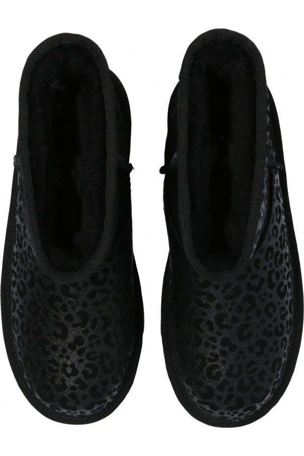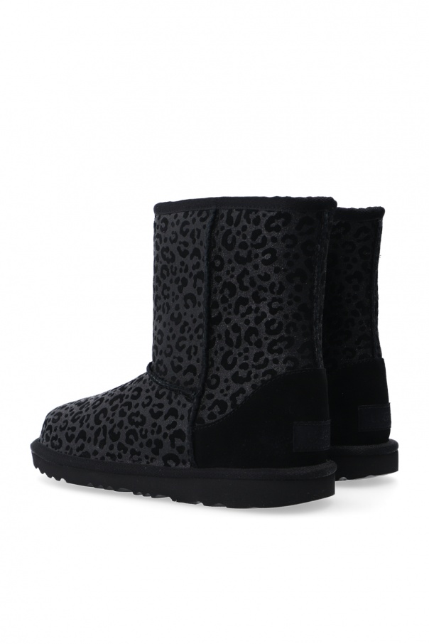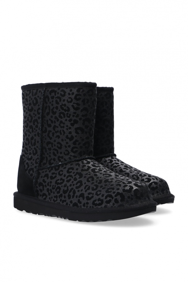 Black ‘T-Classic II Glitter Leopard’ snow boots from UGG Kids. Crafted from suede and lined with sheep wool, this model is complete with stitching details, a leopard print, silver-tone glitter, a logo appliqué sewn on at the heel and a textured EVA sole in black.
