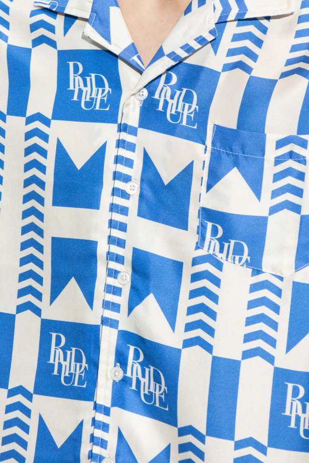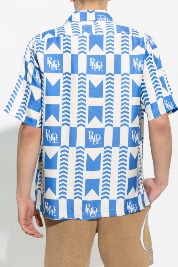 White and blue shirt from Rhude. Made of silk, this style showcases a decorative logo pattern. It is complete with a slip chest pocket, button fastenings, short sleeves and side slits.