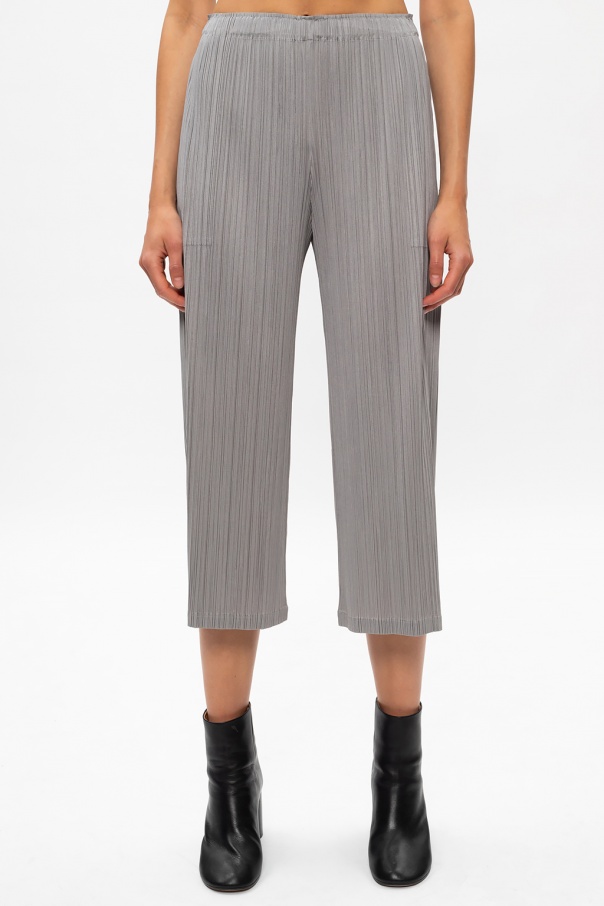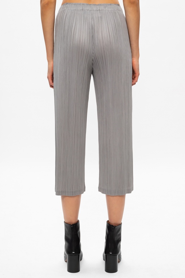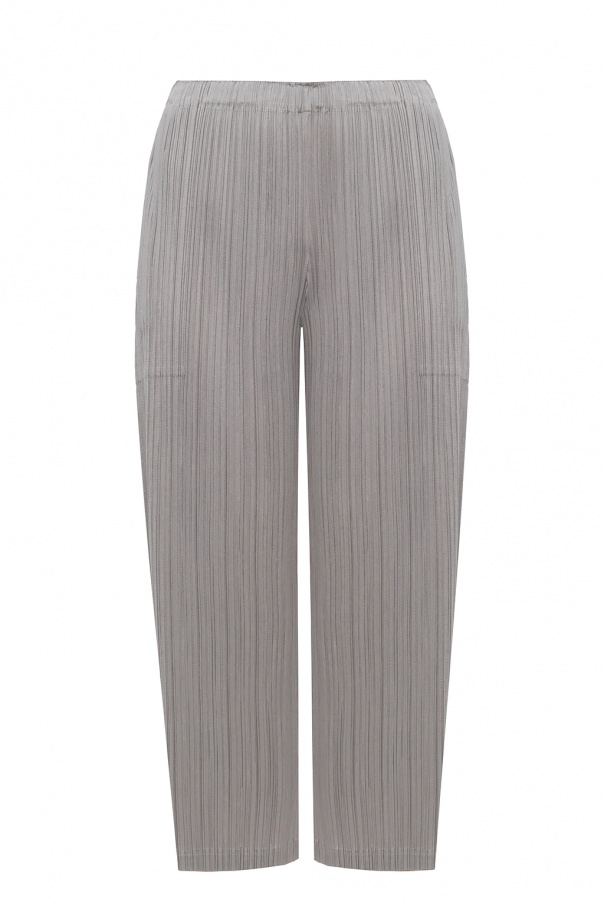 Grey trousers from Issey Miyake Pleats Please. Arrayed with the label\'s signature pleating, this pair features an elasticated waistband and straight legs that fall above the ankle.