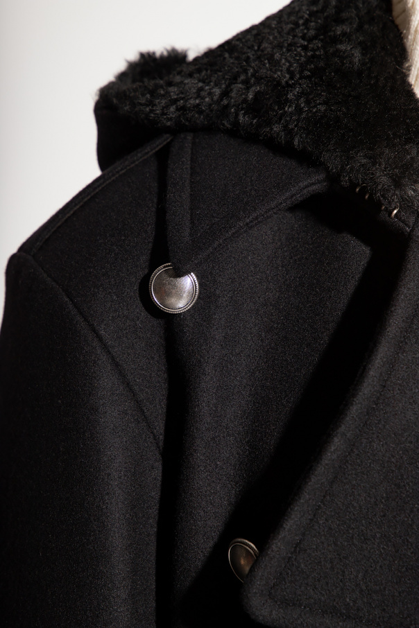 Short, black jacket from Saint Laurent. Made of wool, this garment fastens with hooks and decorative antique silver-tone buttons. It is complete with epaulette details, detachable hood with lamb fur and long sleeves with ribbed cuffs.