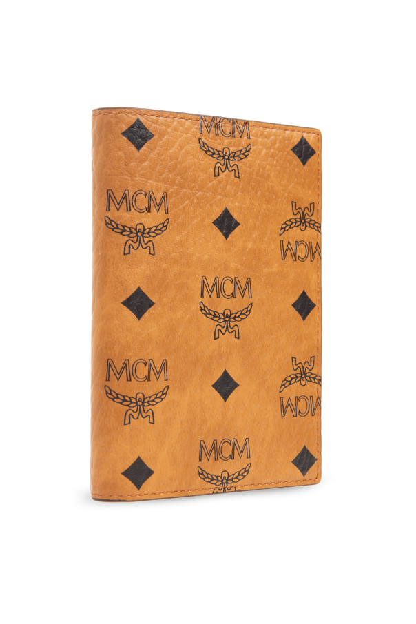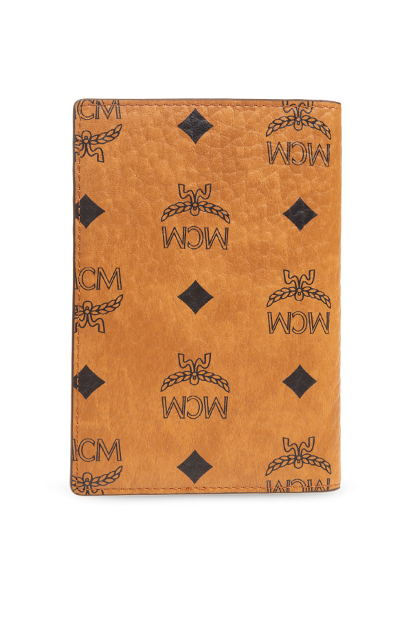 Brown passport holder from MCM. Made of canvas faux leather, this item features a black logo pattern as well as five card slots and one passport compartment inside.