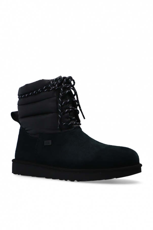 Black ‘Lace Up’ snow boots from UGG x Stampd. Constructed of suede and durable Ripstop nylon, this model is insulated with down fill certified by the Responsible Down Standard. It also features Innovative DryTech membrane for enhanced protection from the elements, a black rubber sole, an insole made from UGGplush™ wool blend and two removable rubber shoe guards in black and white.