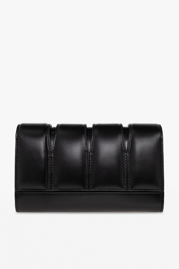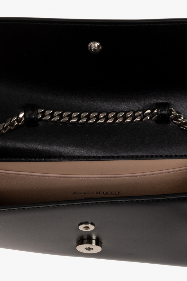 Black ‘The Slash’ quilted clutch from Alexander McQueen. Crafted from lamb leather, this design secures with a snap and features a cut-out flap, a decorative knuckleduster handle enriched by Swarovski crystals, a detachable chain shoulder strap with a toggle closure, silver-tone metal elements and one internal compartment with one slip pocket and one card slot.