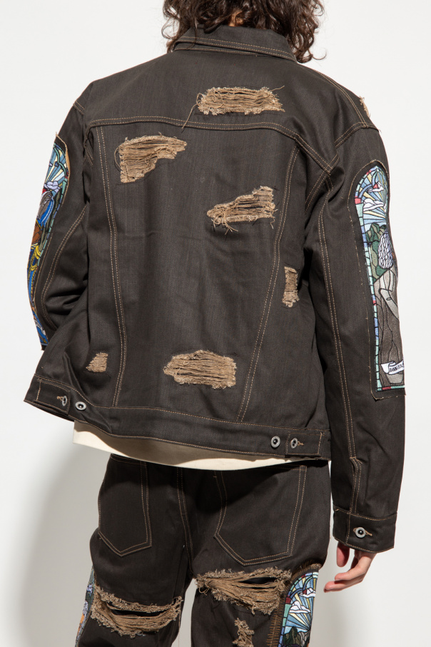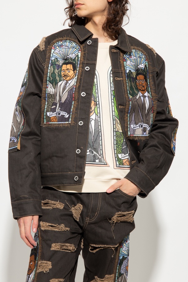 Black ‘Monument’ denim jacket from Who Decides War X Barriers NY. Embellished with colourful stained glass-inspired patches depicting acclaimed African-American activists like Martin Luther King Jr. and Malcolm X, this style features button fastenings, topstitched detailing, a stonewashed treatment, two slip pockets and long sleeves with button cuffs.