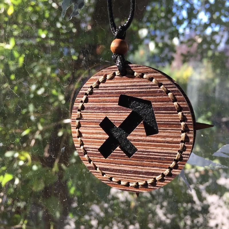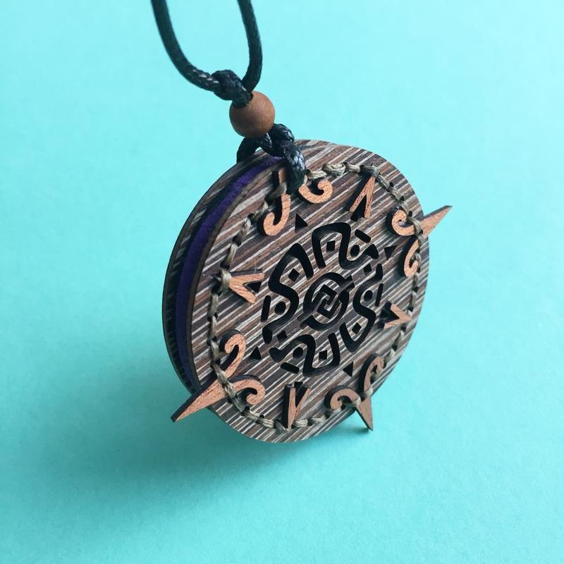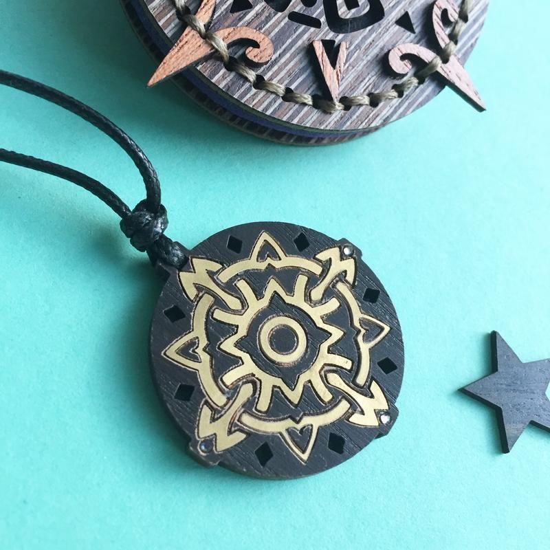 Подвесное украшение в виде автомобиля состоит из множества мелких деревянных деталей, ожерелье подвески выполнено из дерева с инкрустацией орнаментом с использованием металлизированного золотого картона