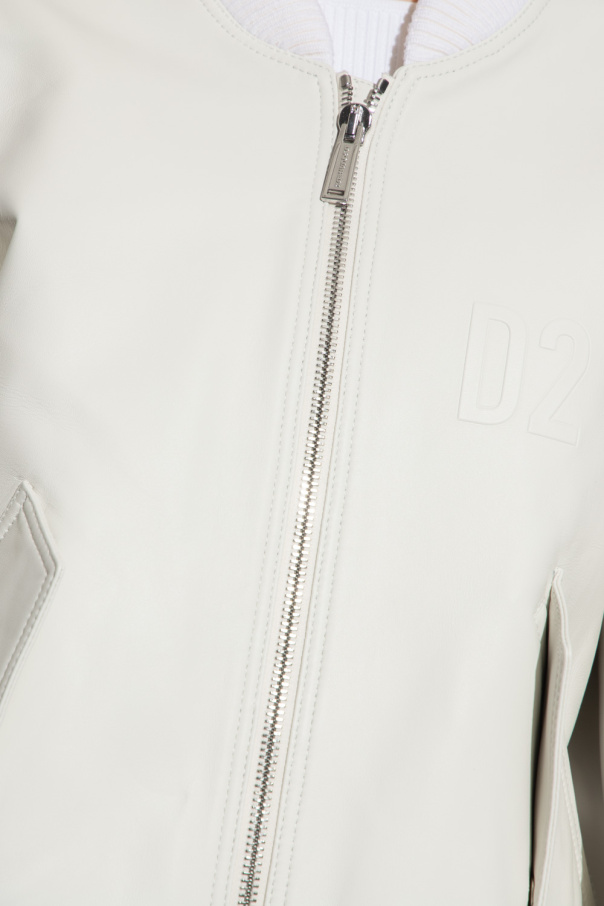 Cream bomber jacket from Dsquared2. Made of lamb leather, this oversize garment features a two-way zip, raised logo, multiple pockets on the shoulder, two snap-fastened front pockets and ribbed trims at the collar, hem and cuffs.