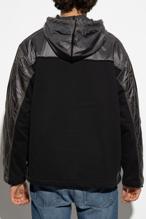 Black and grey ‘J-ROMBE’ hoodie from Diesel. Made of cotton, this style fastens with a two-way zipper and features an embroidered logo, textured inserts, two snap-fastened front pockets and drawstrings on the hood, bottom hem and cuffs.